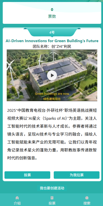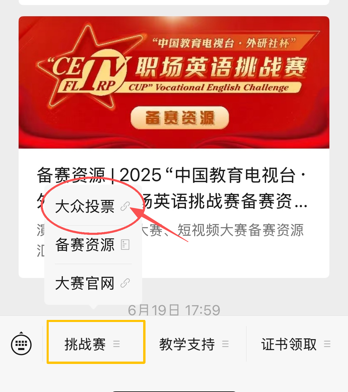 方式二:进入“外研职教”公众号后点击底部菜单栏“挑战赛”—“大众投票”,可跳转大众投票页面。