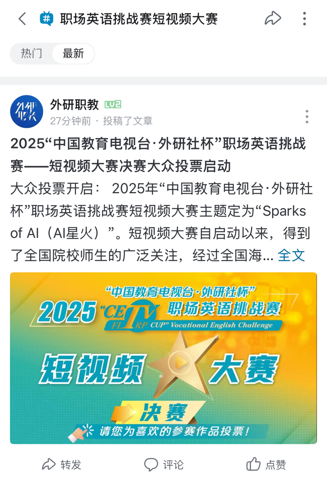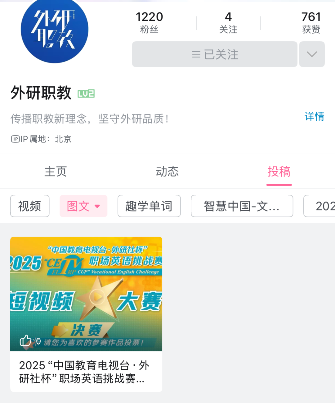方式三:进入bilibili网站或APP,关注“外研职教”,通过首页专栏进入投票网页。或进入#职场英语挑战赛短视频大赛话题,查看投票详情。