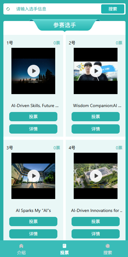 点击“投票”按钮为支持的选手投票。每个微信号每天可投票5次,可为同一选手投票不超过3次。点击“详情”进入详情页。