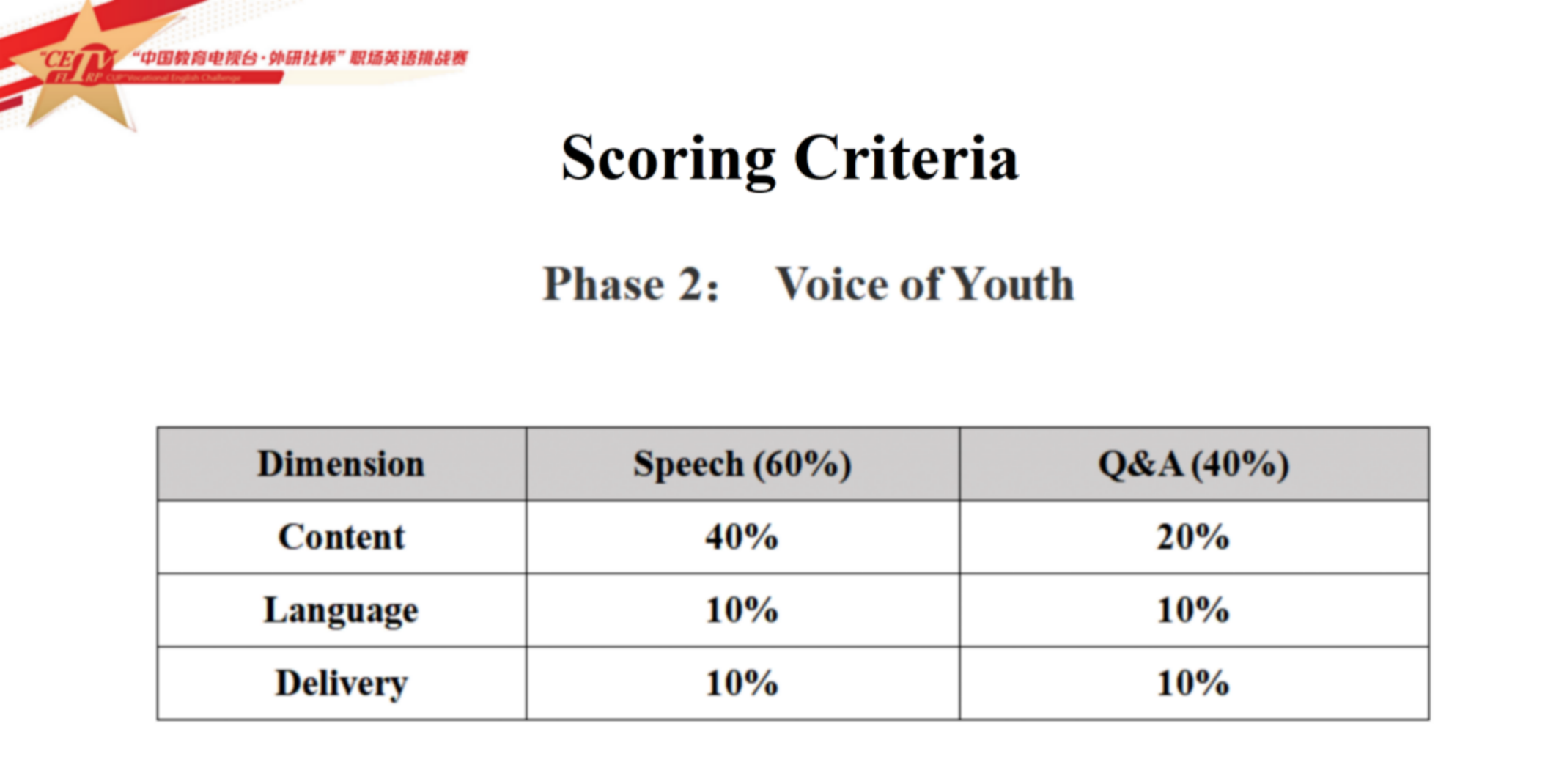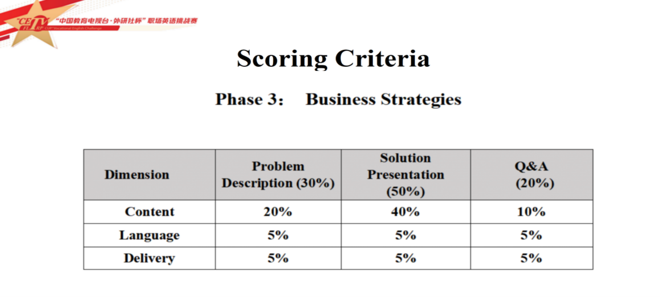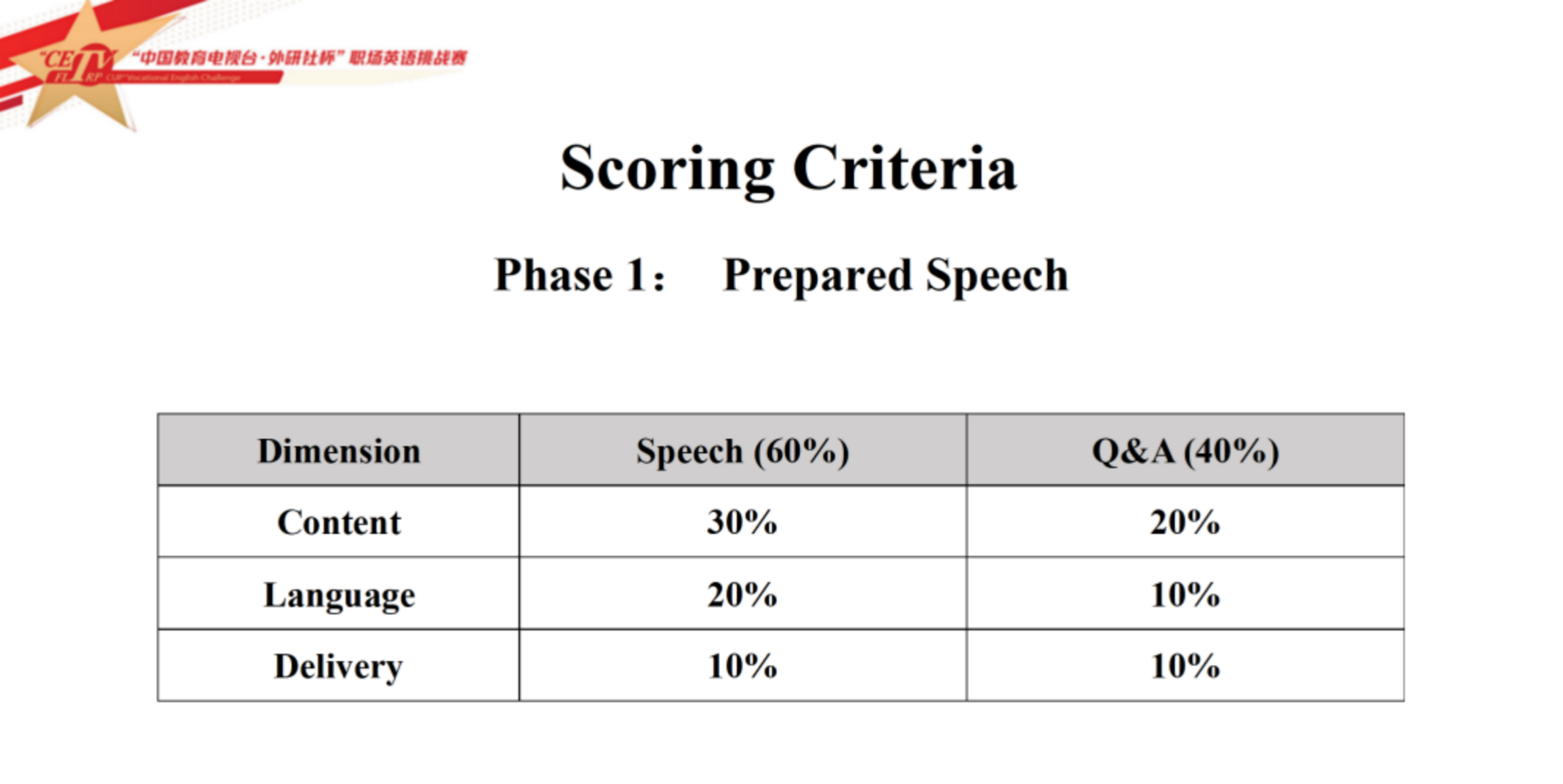 Contestants work in pairs to complete a business communication task in 5 minutes, and then give a 2-minute report separately. The question master will ask each contestant 1 question. Please answer the question within 1 minute. The 2 contestants will be scored separately.