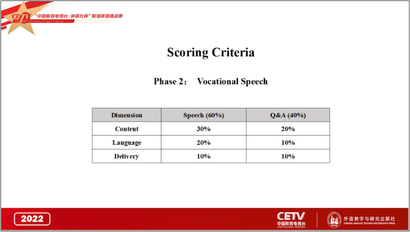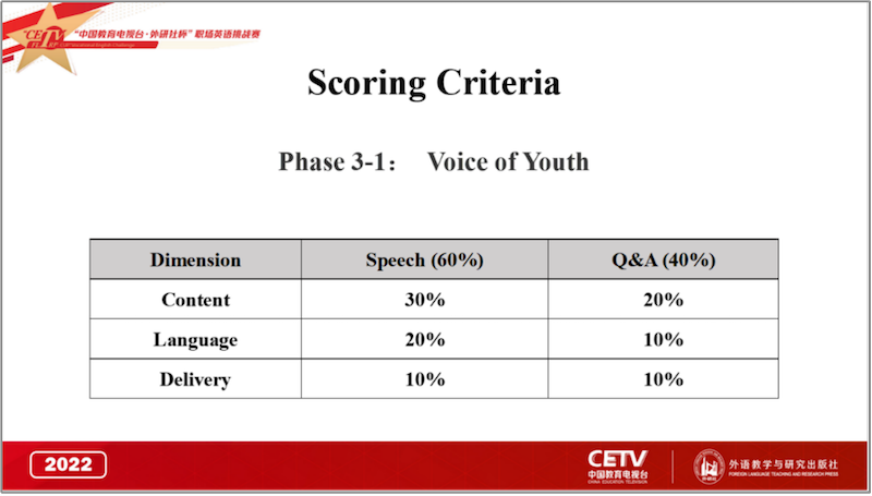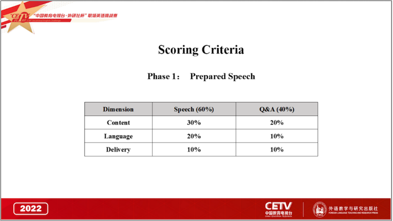 选手上场前从6道视频题目中抽取1道,观看视频后进行3分钟英语演讲。提问评委就选手演讲内容提出1个问题。问题回答时间为1分钟。