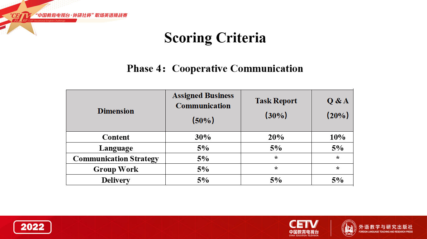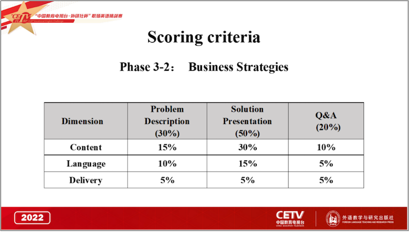 Contestants work in pairs to complete a business communication task in 5 minutes, and then give a 2-minute task report separately. The question master will ask each contestant 2 questions. Please keep the answer to each question within 1 minute. The 2 contestants will be scored separately.