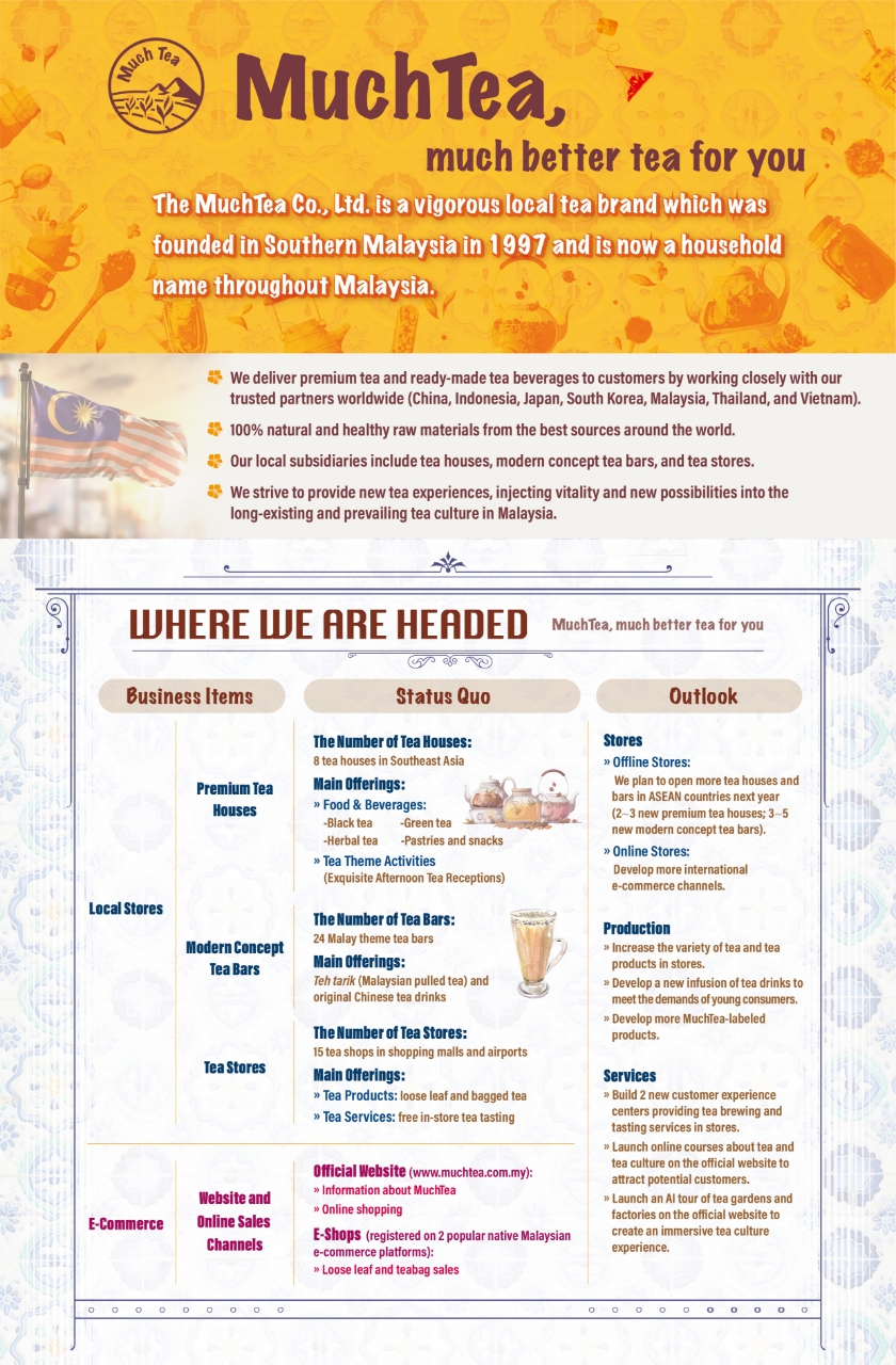 The Evergreen Tea Group is planning to expand its overseas market in ASEAN countries. MuchTea wants to expand and innovate its business and is looking for a reliable tea supplier in China. A meeting is set up to explore the business opportunity.