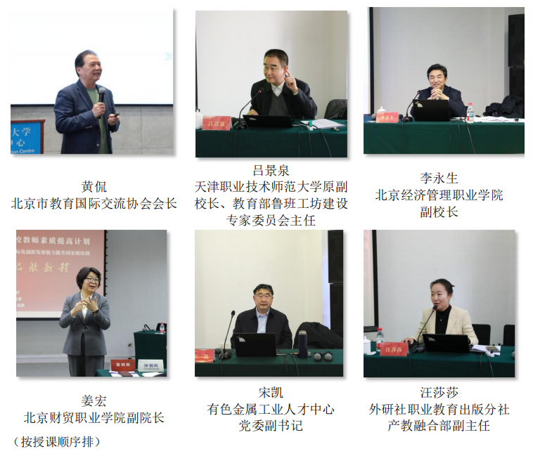 本次培训特别邀请北京市教育国际交流协会会长黄侃,天津职业技术师范大学原副校长、教育部鲁班工坊建设专家委员会主任吕景泉,北京经济管理职业学院副校长李永生,北京财贸职业学院副院长姜宏,有色金属工业人才中心党委副书记宋凯,外研社职教分社产教融合部副主任汪莎莎围绕“习近平新时代中国特色社会主义思想、职业教育国际化办学理论与政策、全球化视野与跨境办学项目设计及管理、国际品牌建设”等主题展开分享,帮助参训领导实现国际化办学的“认知-能力-实践-创新”四维提升。